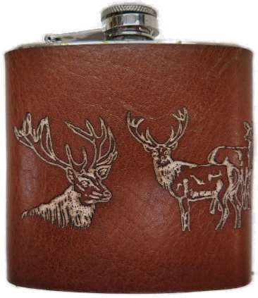 Flachmann, 10x10cm 6oz, mit Ledereinfassung, mit Laser-Sujet Wildtiere.