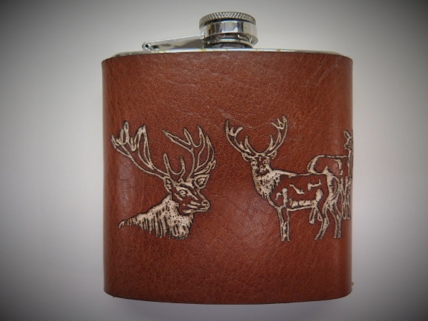 Flachmann mit Ledereinfassung, im Leder sind Wildtiere.