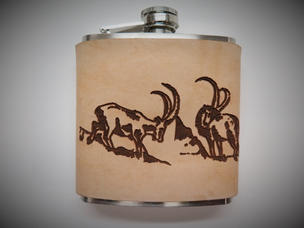 Flachmann mit Ledereinfassung, im Leder sind Wildtiere.