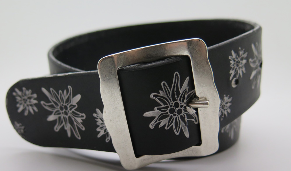Schwarzer Ledergürtel, mit weissem Handeingefärbten Sujet.