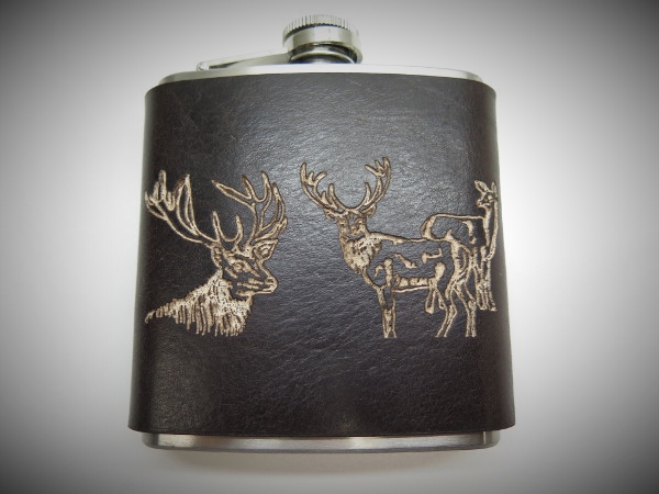 Flachmann mit Ledereinfassung, im Leder sind Wildtiere.