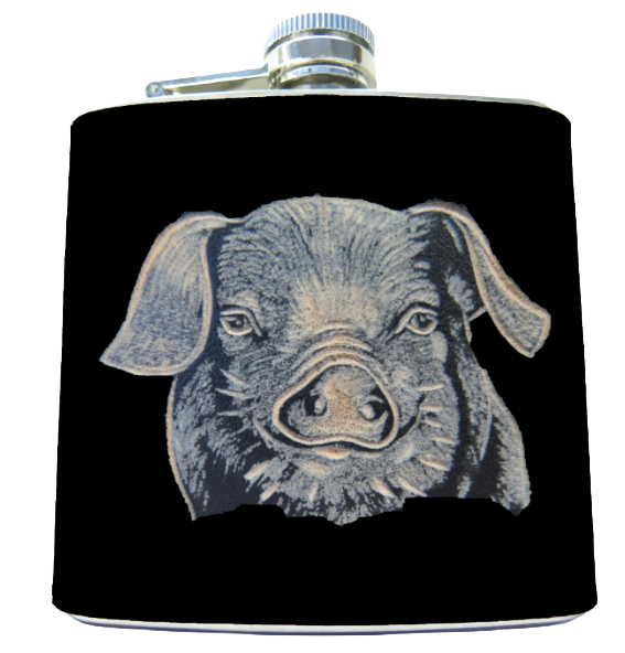 Flachmann, 10x10cm 6oz, mit Ledereinfassung, mit Sujet-Hangschnitzt.