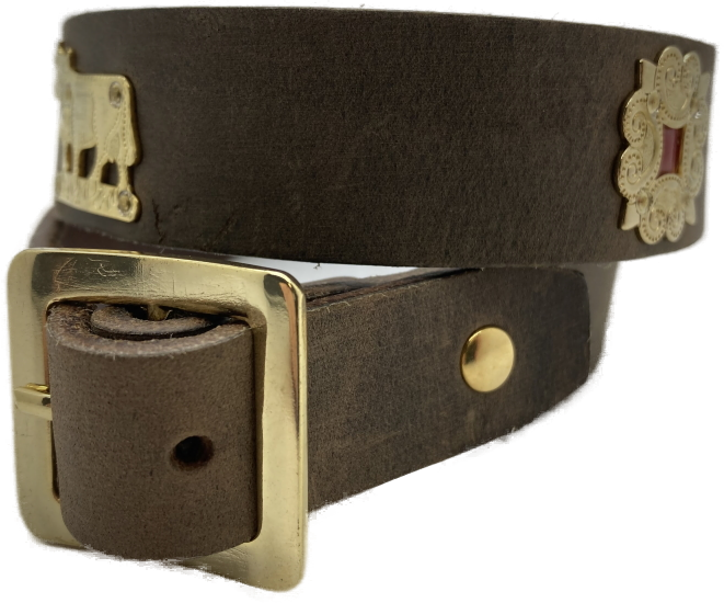 Ledergürtel, 25mm auf 20mm Verjüngt, mit Nägeli-Beschlägen, Kuh und Rose: NS, AS, MS.