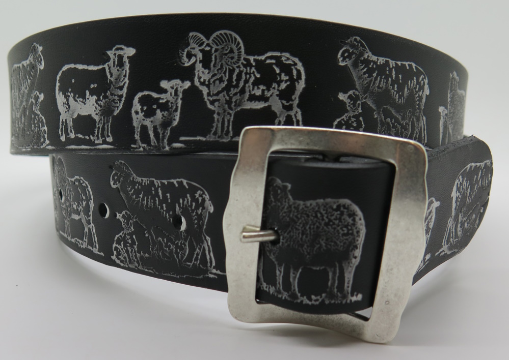 Schwarzer Ledergürtel, mit weissem Handeingefärbten Sujet.