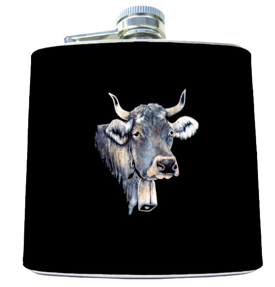 Flachmann, 10x10cm 6oz, mit Ledereinfassung, mit Sujet-Hangschnitzt.
