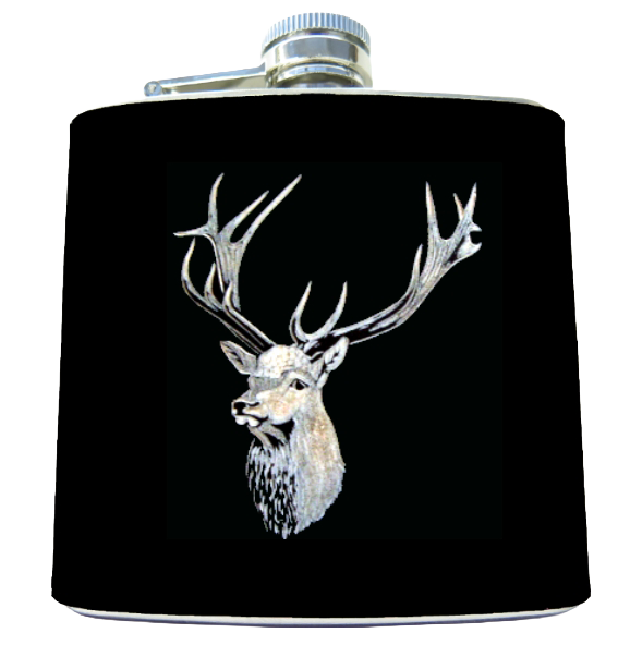 Flachmann, 10x10cm 6oz, mit Ledereinfassung, mit Sujet-Hangschnitzt.