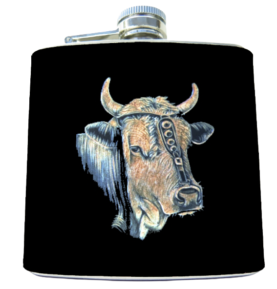 Flachmann, 10x10cm 6oz, mit Ledereinfassung, mit Sujet-Hangschnitzt.